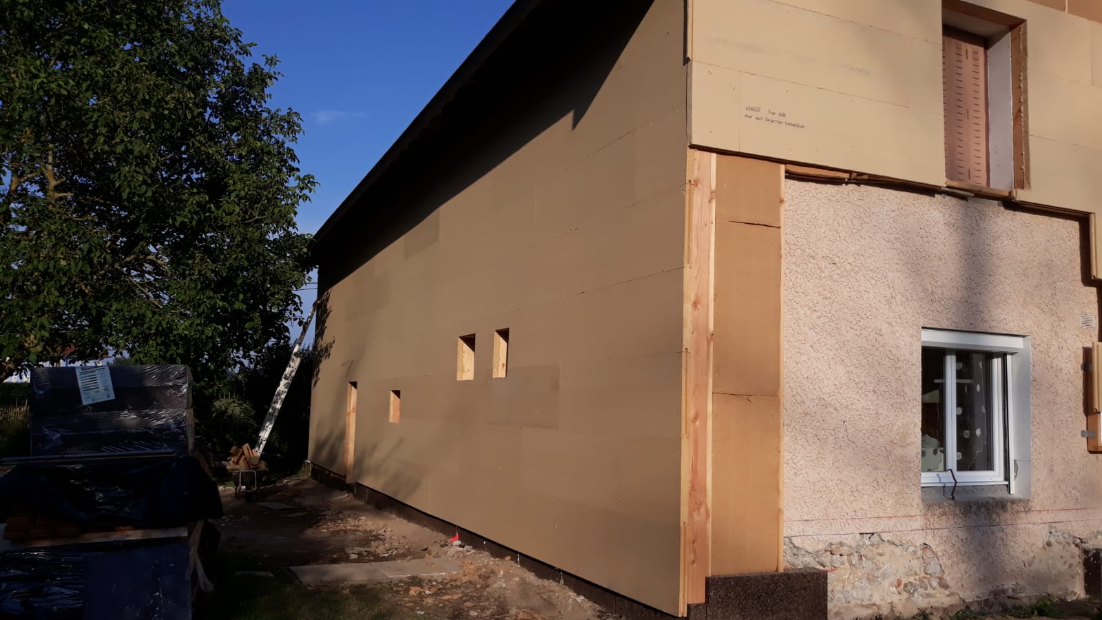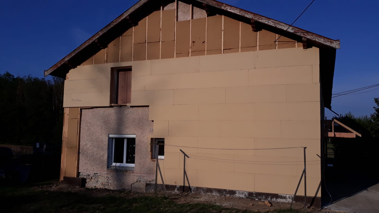 ITE (isolation extérieure) en panneaux de bois sur mur en Pisé